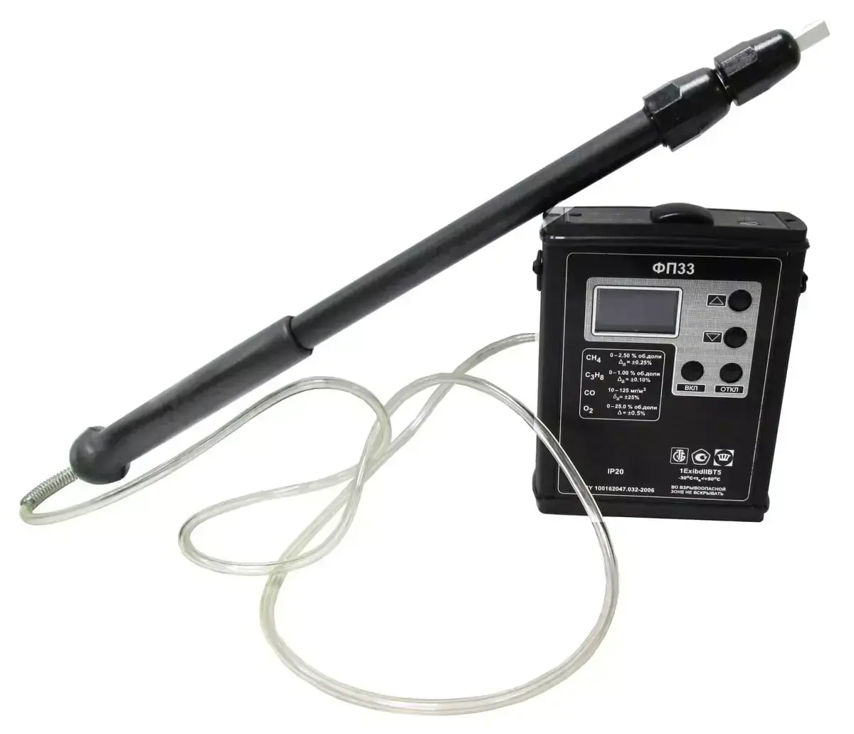 Газоанализатор ФП33 выполнен в прочном металлическом корпусе и представляет собой трёхкомпонентный (на 3 газа) взрывозащищённый портативный прибор с принудительным отбором пробы.